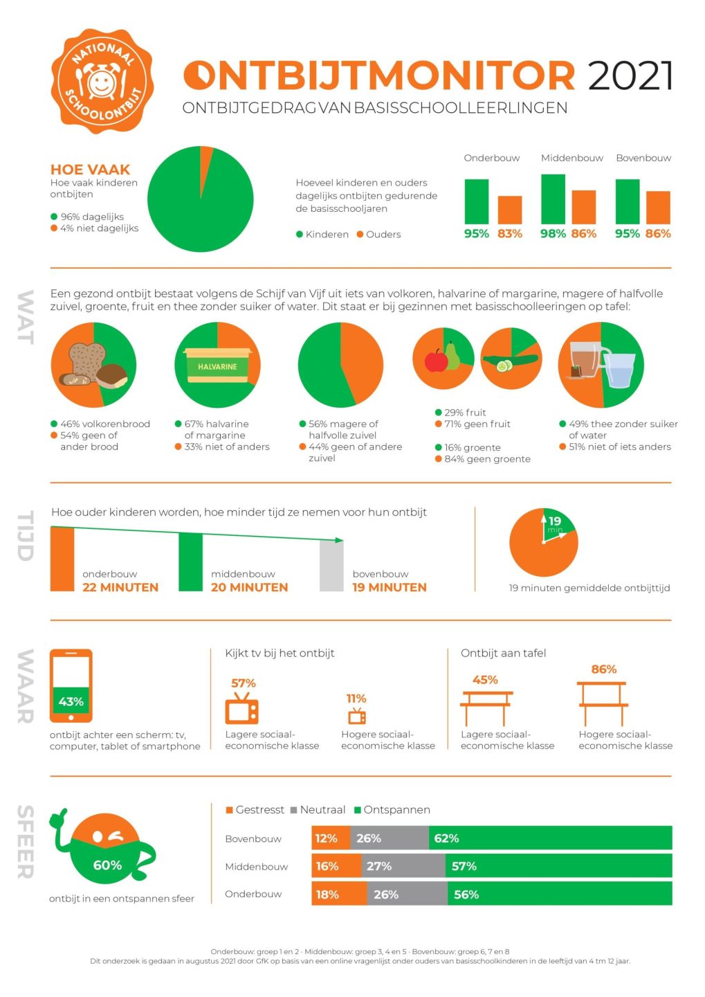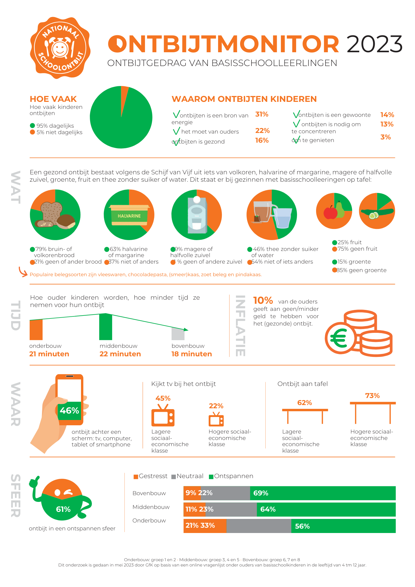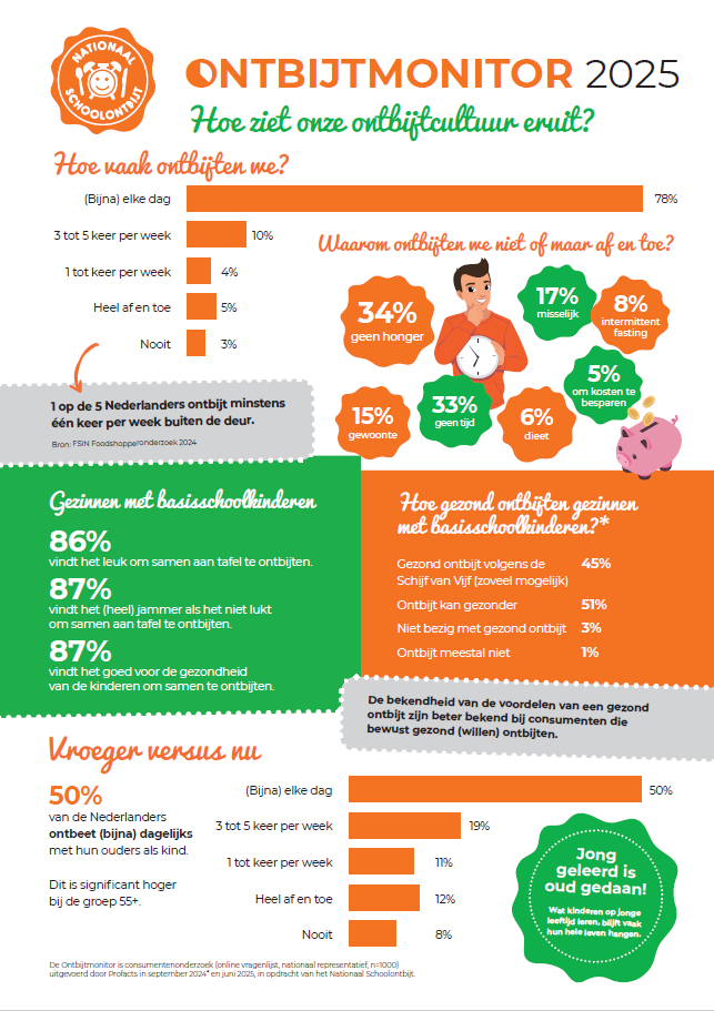 Het Nationaal Schoolontbijt doet tweejaarlijks onderzoek naar het ontbijtgedrag in Nederland en specifiek van basisschoolleerlingen in de leeftijd van 4 tot en met 12 jaar. De resultaten van de Ontbijtmonitor 2025 zijn bekend en laat zien dat aandacht voor een gezond ontbijt nog altijd van belang is. En dat we niet altijd ontbijten zoals we zouden willen: samen, met aandacht voor elkaar en het gezonde ontbijt. Daarom blijven we herhalen: een goede start van de dag begint met een gezond ontbijt aan tafel!